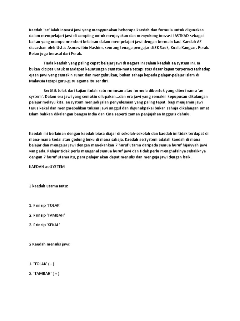 Asmawi Hashim - AE SYSTEM JAWI SK sauk 10. Lepas covert copy dan paste kat microsoft word 3. Kaedah ae ialah inovasi jawi yang menggunakan beberapa kaedah dan formula untuk digunakan dalam mempelajari jawi di sampiing untuk menjayakan dan menyokong inovasi LASTKAD sebagai bahan yang mampu memberi kelainan dalam mempelajari jawi.